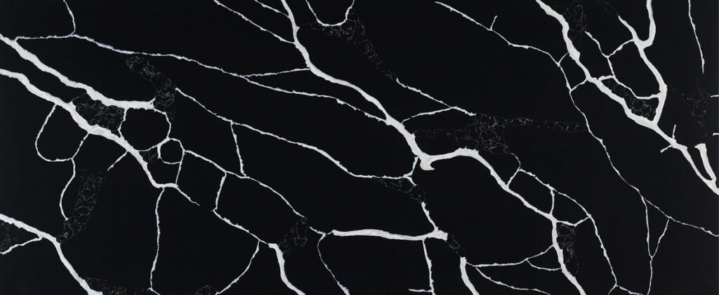 This material features a deep black foundation with striking, high-contrast white veining. The pattern mimics a shattered or "cracked ice" effect, with bold lines and textured white patches cutting through the dark surface. It offers a powerful, modern aesthetic with sharp geometric movement.