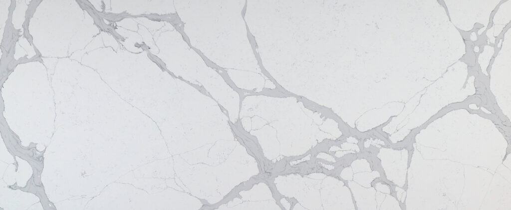 This quartz features a bright white foundation with a dynamic network of multi-toned gray veining. It combines thick, flowing ribbons containing unique textured fills with sharp, splintered fractures. The mix of bold structures and delicate lines creates a sophisticated, high-end look.
