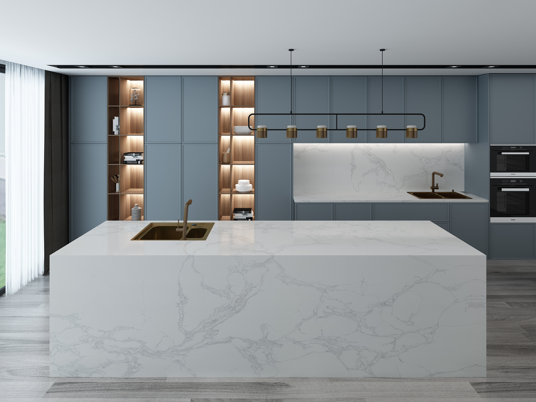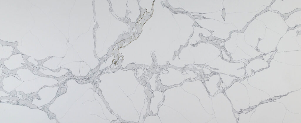 This quartz features a bright white foundation with a complex, interconnected web of multi-toned gray veining. The pattern is distinguished by thick, "river-like" structures containing unique textured fills and golden-brown accents. These bold channels are balanced by sharp, splintered fractures that branch across the slab for a high-end, organic look.