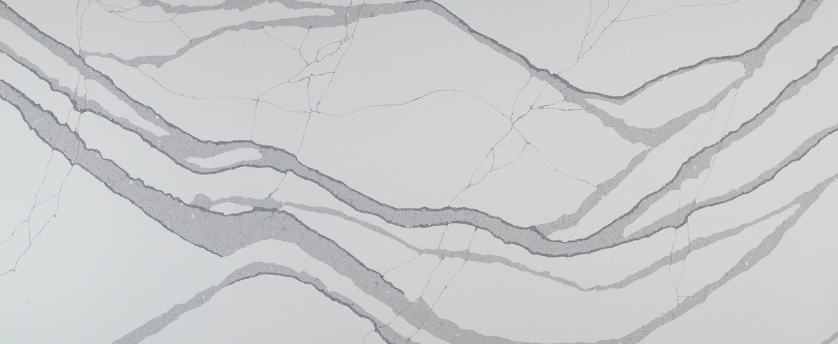 This quartz features a bright white foundation with thick, rhythmic gray ribbons that flow diagonally in a soft, undulating motion. The feathered edges of the veining and occasional spindly fractures create a natural, fluid appearance. It captures the elegant movement of classic Calacatta marble with a clean, modern finish.