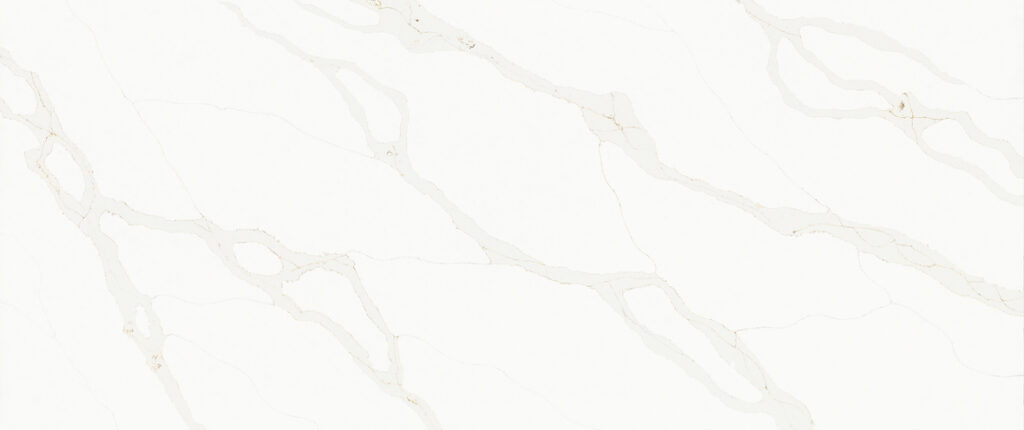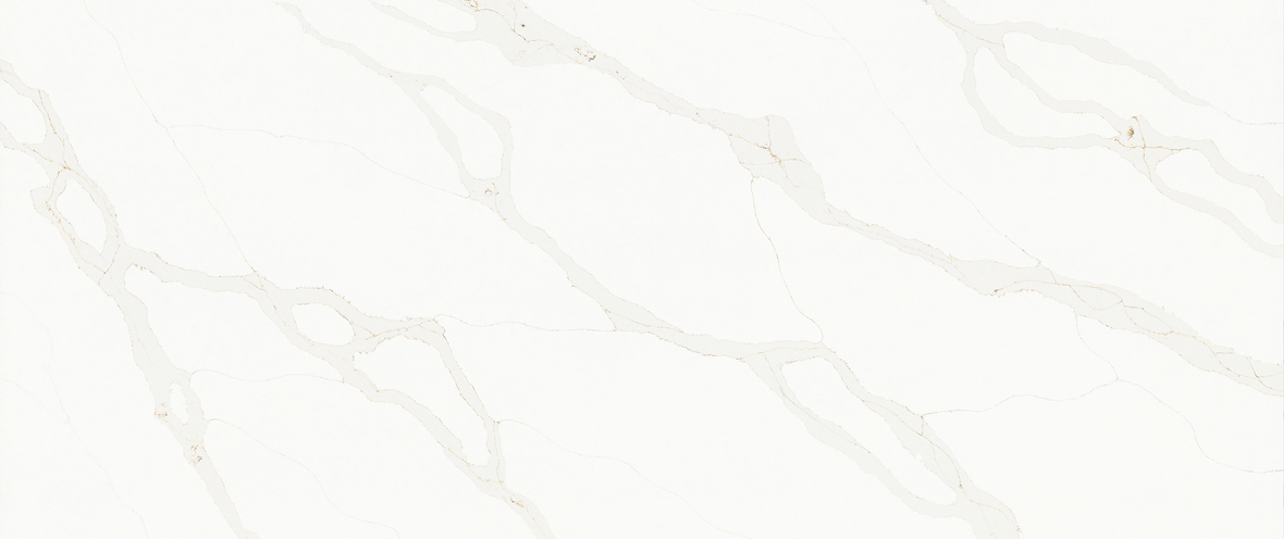 This quartz slab features a luminous white surface accented by long, flowing veins of soft gold and honey. The warm, rhythmic pattern offers a radiant and prestigious aesthetic that pairs beautifully with champagne bronze fixtures or natural wood cabinetry for a truly high-end finish.