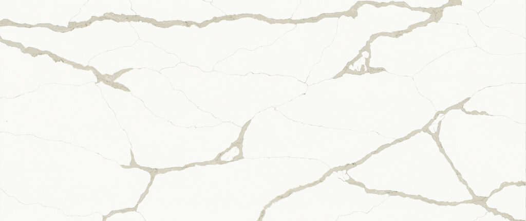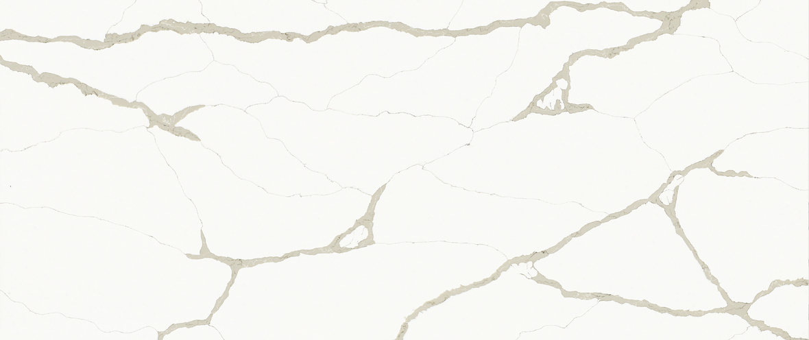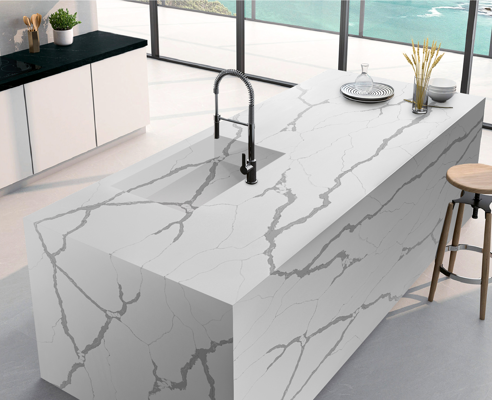 This quartz slab features a bright white canvas electrified by thick, jagged veins of cool slate grey. The bold, fractured movement creates a dramatic architectural look that serves as a powerful focal point for modern islands or full-height feature backsplashes.