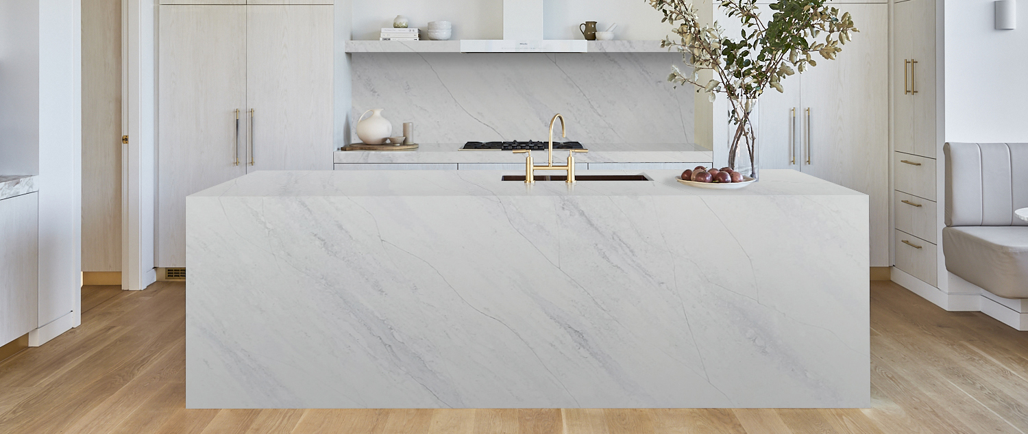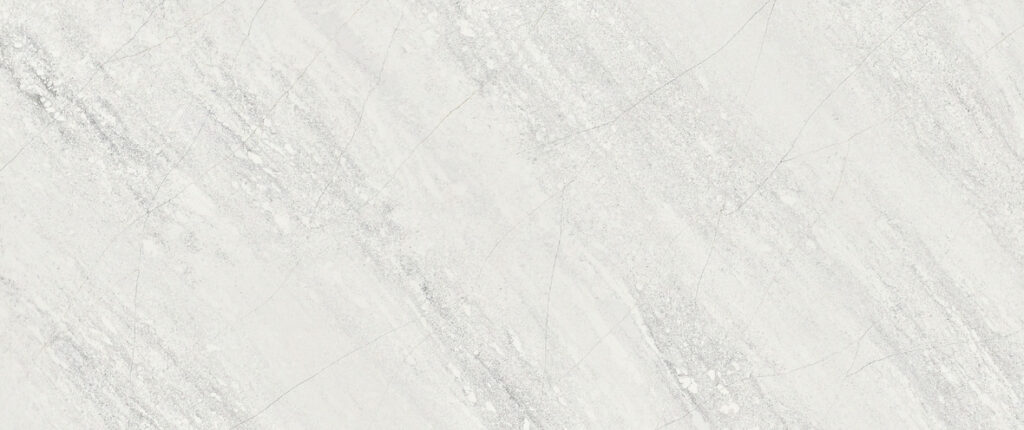 This slab showcases a weathered, industrial aesthetic with a misty grey field and soft, granular textures that resemble polished concrete or fine-grained granite. Faint, diagonal fissures and subtle white speckling add a layer of organic detail, making it a versatile choice for modern, urban-inspired interiors.