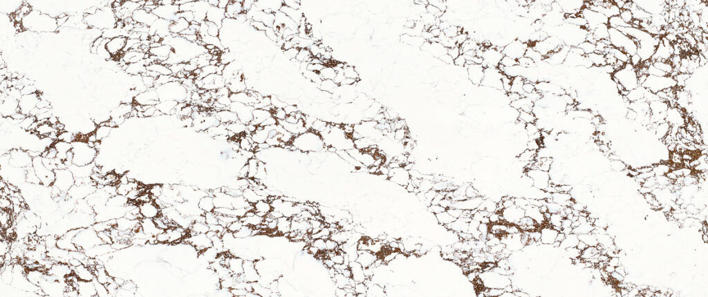 A striking white quartz slab with bold, dramatic chocolate brown veining that creates a luxurious and sophisticated natural stone look. This engineered surface offers a timeless and elegant option for high-traffic areas.