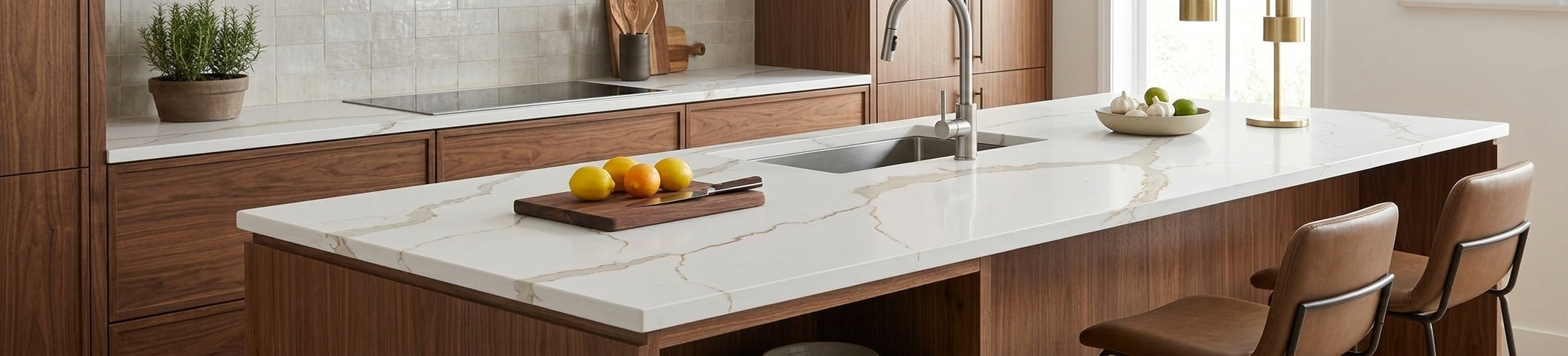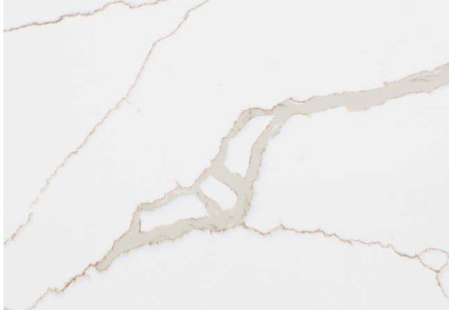Rio features a striking bright white surface detailed with bold, flowing grey and gold veining that mimics the look of luxury marble. This elegant quartz creates a high-end, dramatic statement for kitchen islands and waterfall edge countertops.