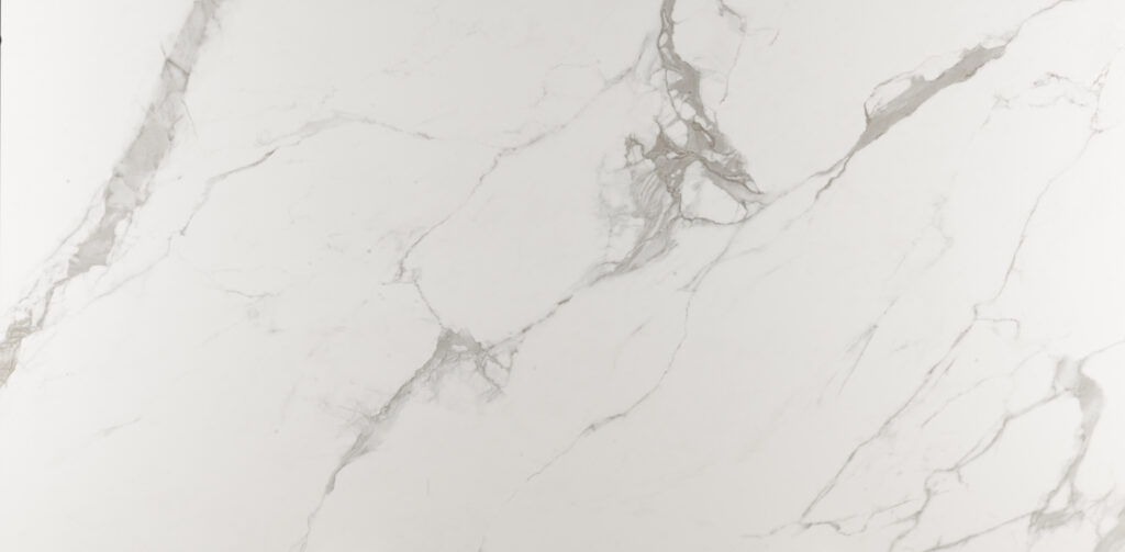 This porcelain slab features a bright, luminous white foundation that serves as a pristine backdrop for sophisticated, fluid veining. The pattern is characterized by soft, sweeping grey movements and concentrated clusters of feathery detail, creating a graceful, high-end aesthetic that captures the timeless elegance of natural Italian marble.