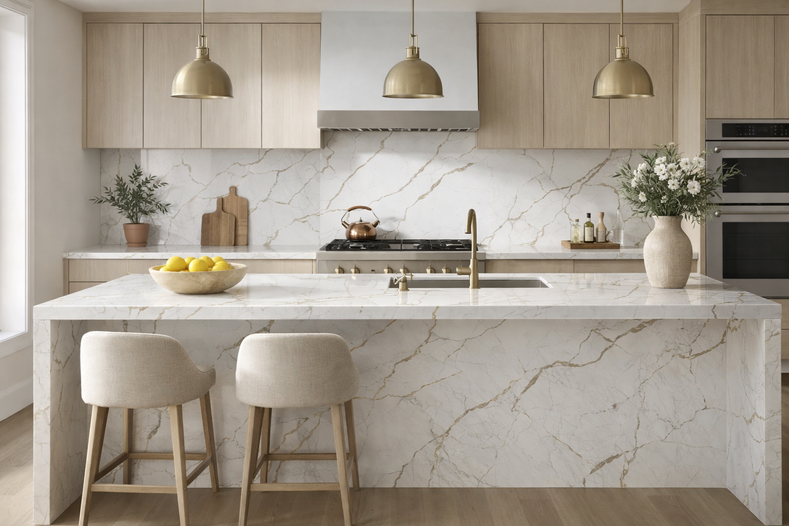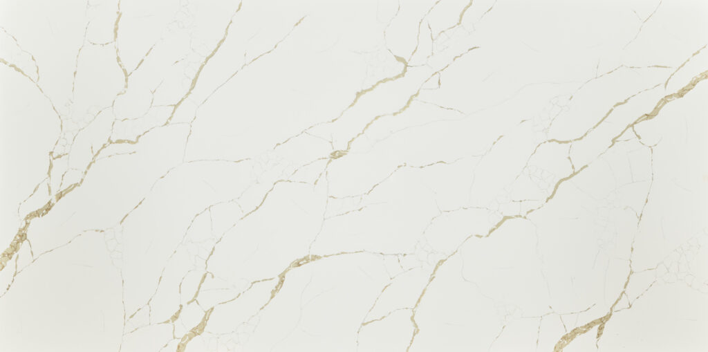 Statuario Massa features a bright, creamy white background detailed with prominent, fractured veining in warm gold and soft grey tones. This quartz offers a dramatic and upscale aesthetic, perfect for making a bold statement on kitchen islands and backsplashes.