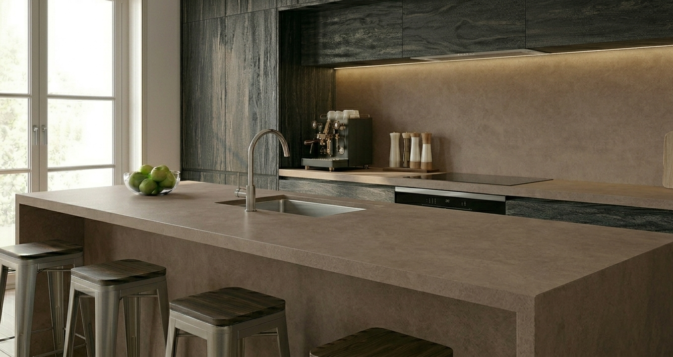 Terra features a warm, silty brown base with a velvety textured finish that evokes the natural essence of dry, fertile earth. Its matte surface and subtle tonal shifts offer a neutral, organic aesthetic, making it an ideal choice for creating grounded and harmonious architectural spaces.