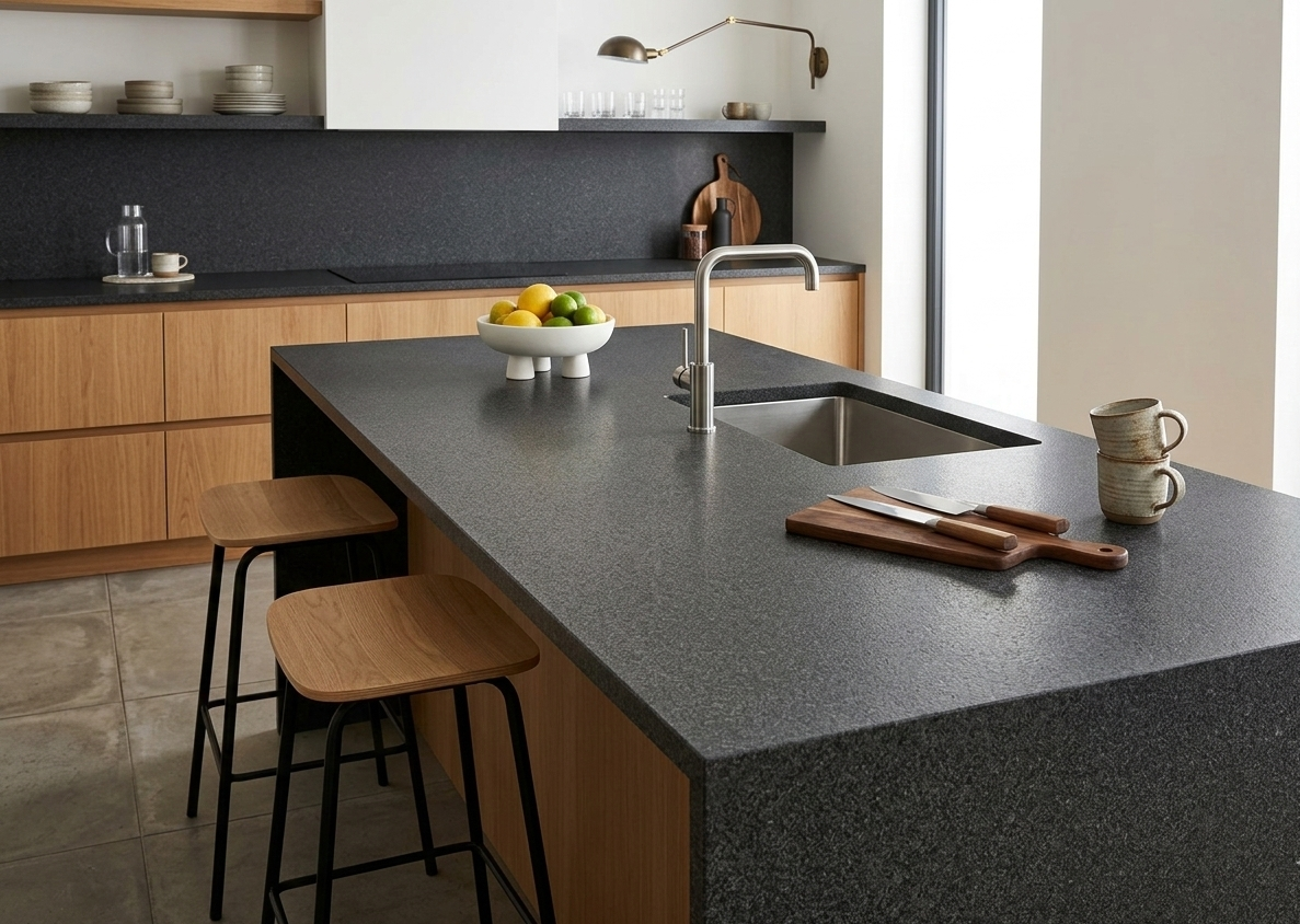 Ural Grey features a dark, slate-colored base with a very fine, uniform grain for a clean and industrial aesthetic. This versatile quartz provides a sophisticated, low-maintenance surface perfect for minimalist kitchen designs or professional office spaces.